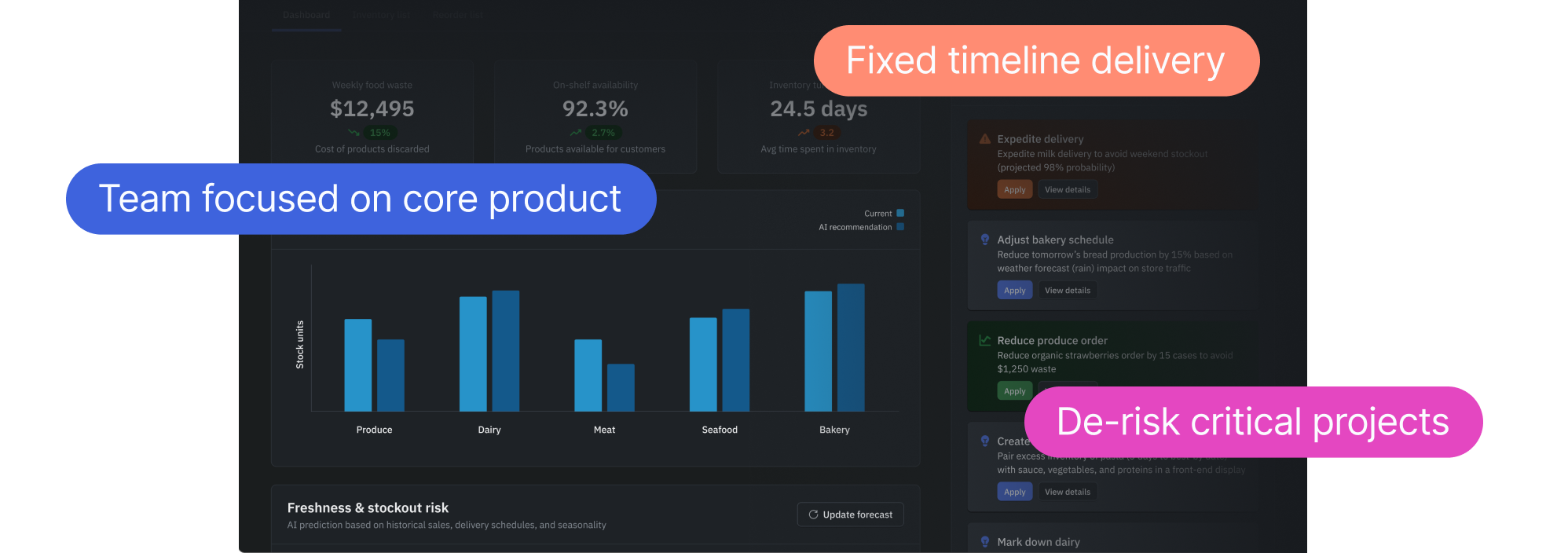 When speed is critical, our forward deployed engineers embed with your team to deliver production-ready apps while ensuring knowledge transfer and flexibility.