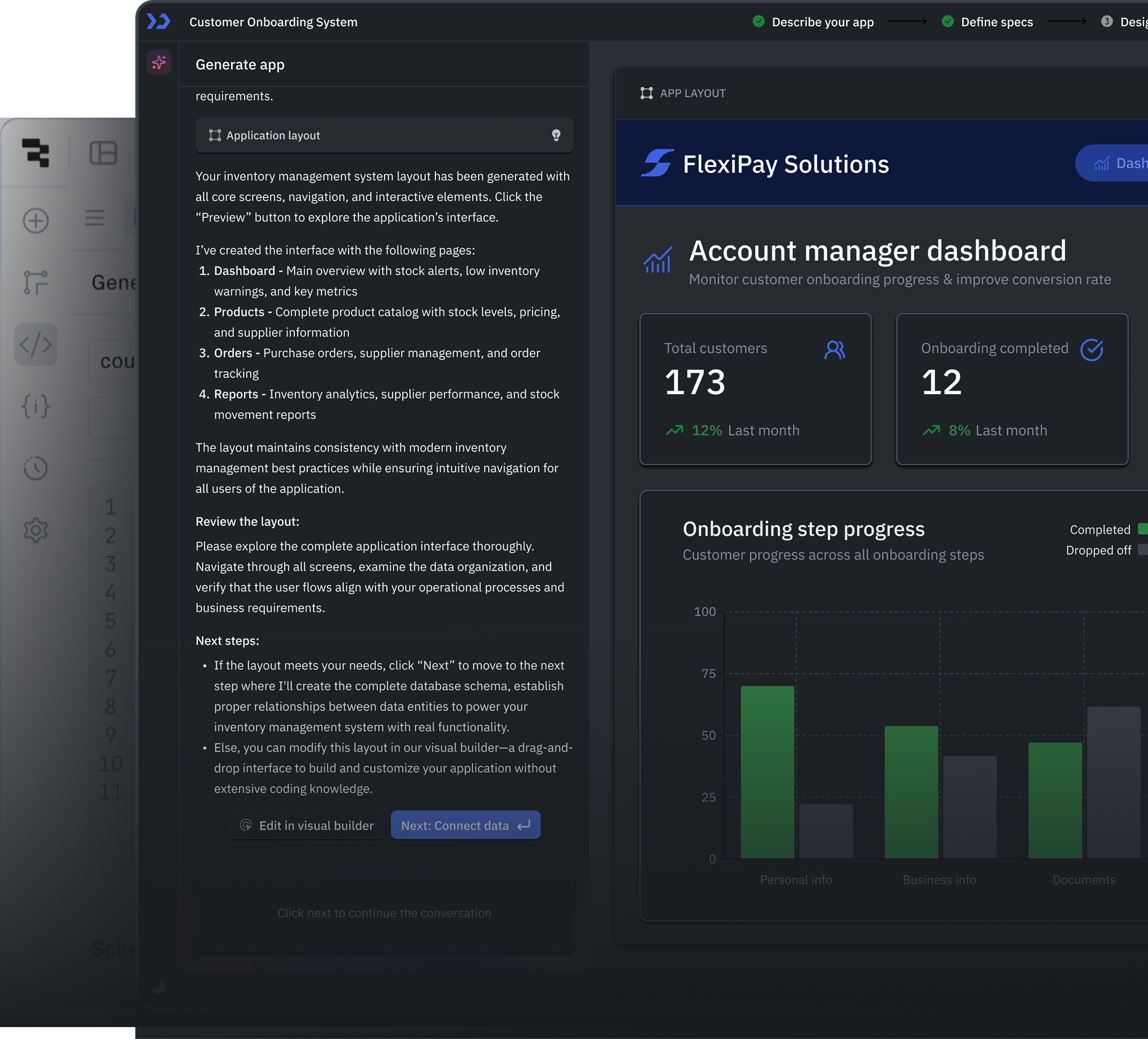 Provides an intuitive drag-and-drop interface for building application layouts with pre-built components.